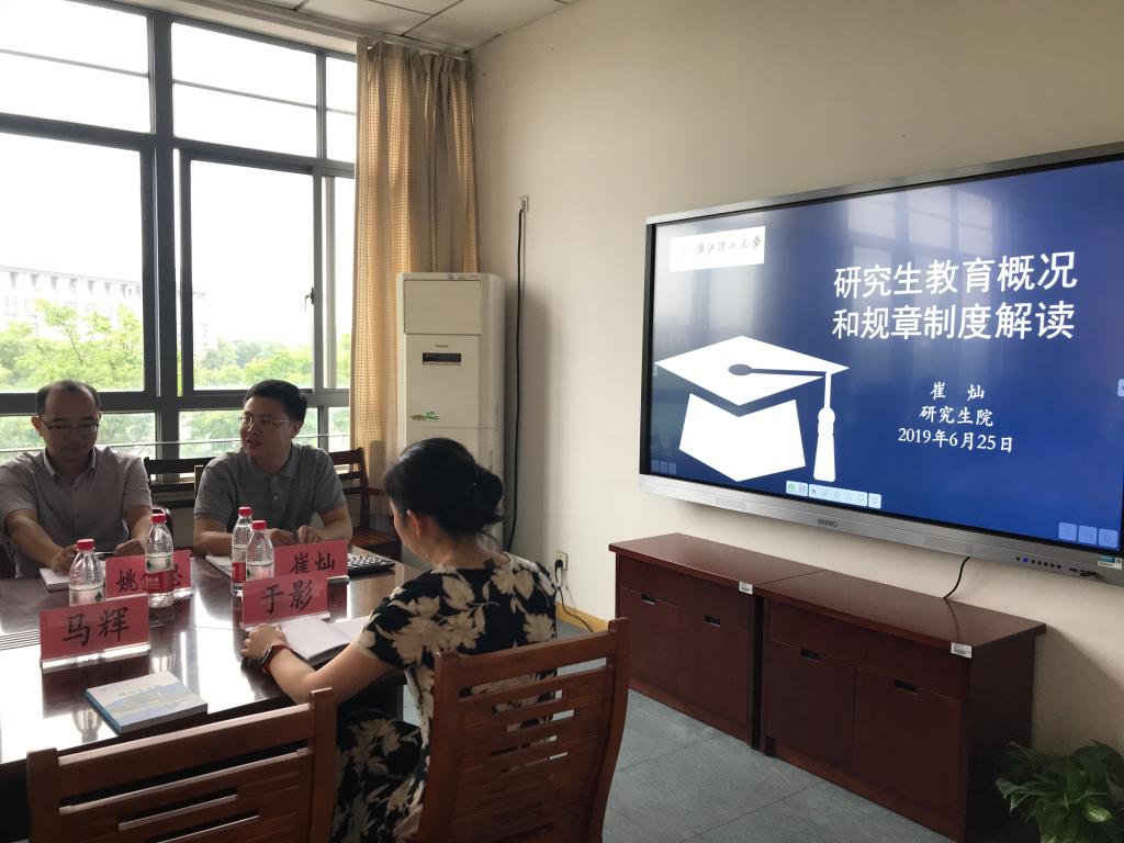14号楼3楼会议室召开。培训会由浙江理工大学研究生院院长崔灿教授主讲,新增浙江理工大学硕士研究生导师参加培训会。