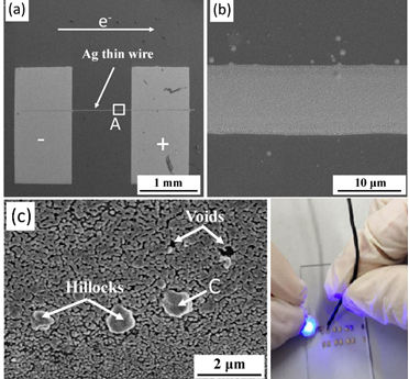 课题组利用电流体动力学(EHD)打印技术制备试样,通过Spin coating添加保护膜,成功抑制了通电过程中的失效现象,延长了柔性电子器件中银导线使用寿命,并分析了保护机理,此技术可应用于柔性电子可靠性领域。