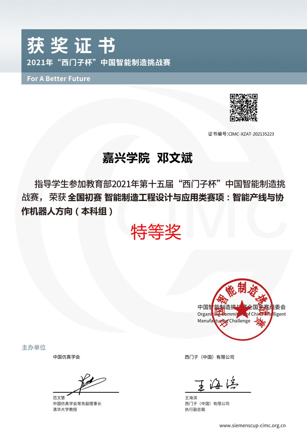 在邓老师的精心指导下,智能制造团队同心协力刻苦攻关,经过激烈角逐,荣获教育部2021年第十五届“西门子杯”中国智能制造挑战赛全国初赛智能制造工程设计应用类赛项:智能产线与协作机器人方向(本科组)特等奖1项;荣获教育部2021年第十五届“西门子杯”中国智能制造挑战赛全国初赛智能制造工程设计应用类赛项:数控数字化双胞胎-虚拟调试方向(本科组)三等奖1项;