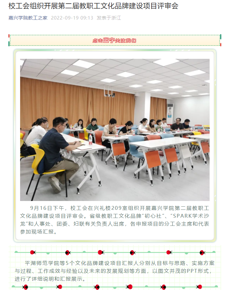 9月16日下午,时时彩 分工会申报的教职工文化品牌项目——《栉风沐雨秉初心 共研共进育新人——学科竞赛育人文化品牌》在兴礼楼209智慧教室进行答辩,经过专家点评,该项目获批嘉兴时时彩 第二届教职工文化品牌建设项目。