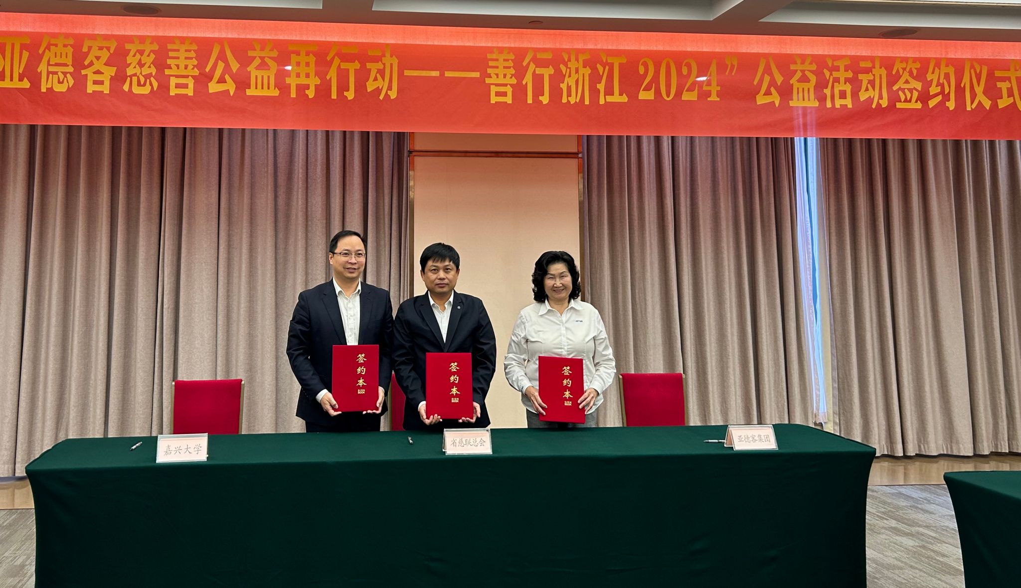 王立玮、楼喻刚和廖锦琳代表三方签署合作协议。亚德客国际集团董事长王世忠先生通过浙江省慈善联合总会向时时彩