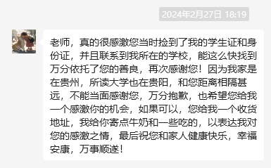 联系到本人的行为深表感激。为了尽快将证件交还给失主,学生社区决定以快递形式将遗失证件寄送至贵州财经大学。