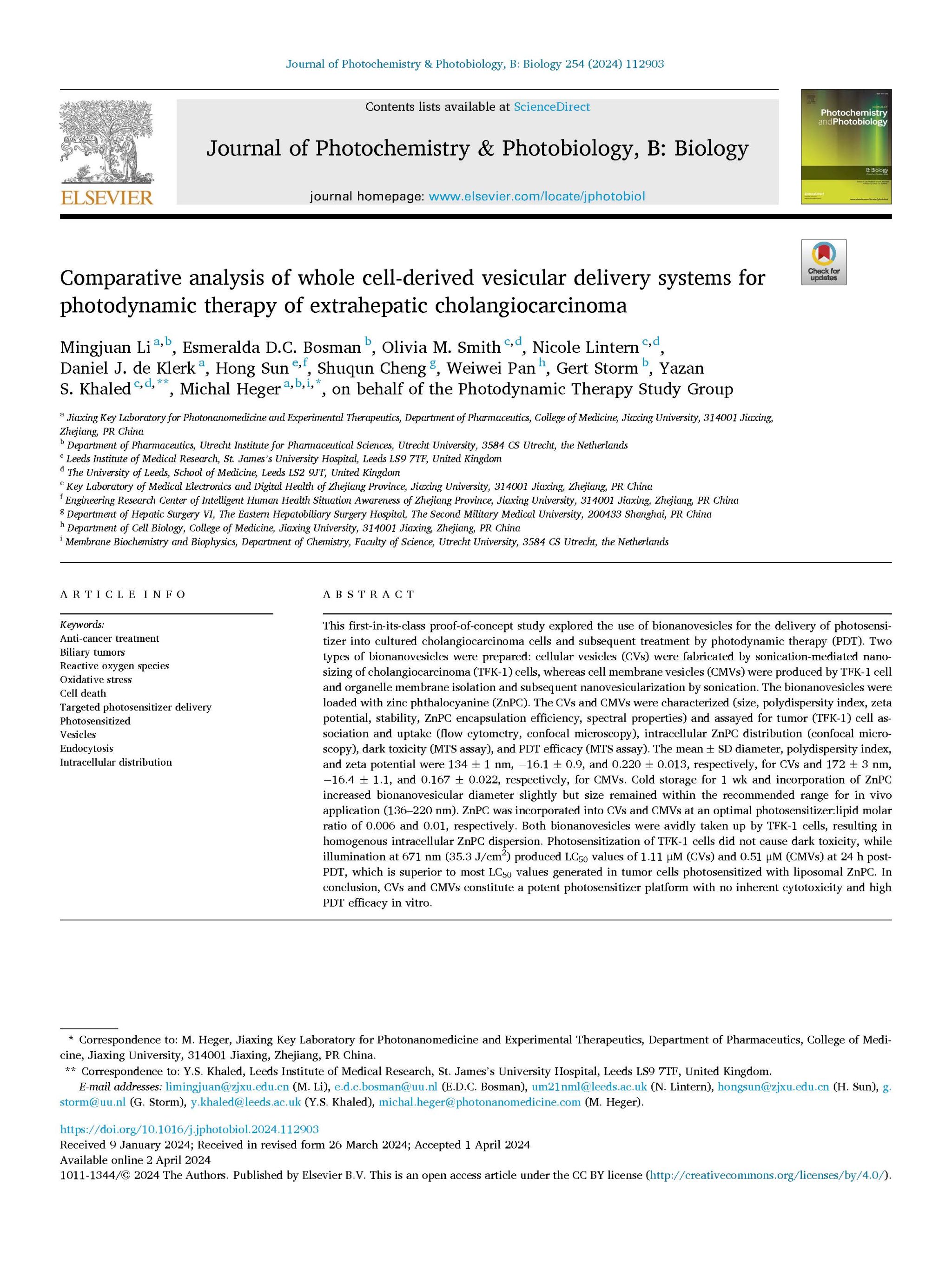 【论文】孙宏,Comparative analysis of whole cell-derived vesicular delivery systems for photodynamic therapy of extrahepatic cholangiocarcinoma